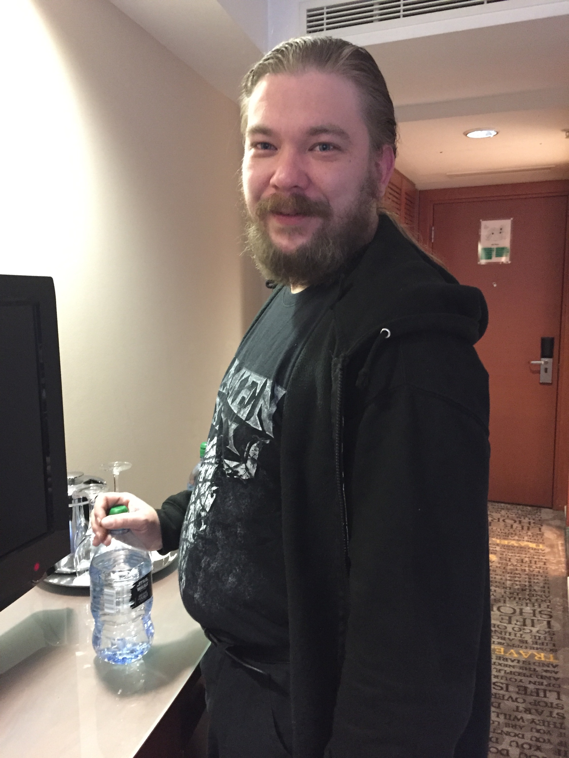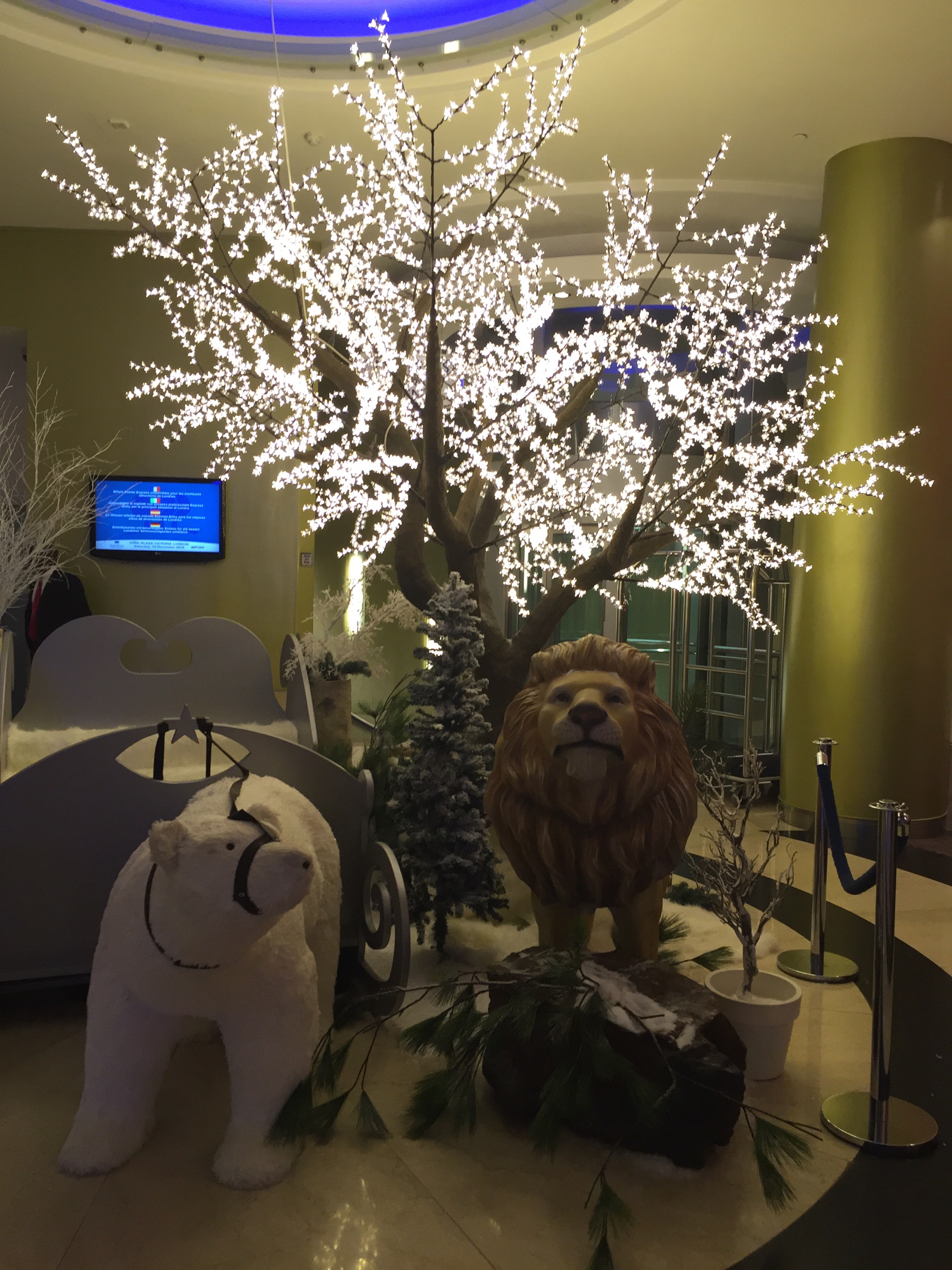 Es war auch trocken und nicht kalt. Das Hotelzimmer ist auch schön. Im Empfangsraum stehen diese zwei Freunde.