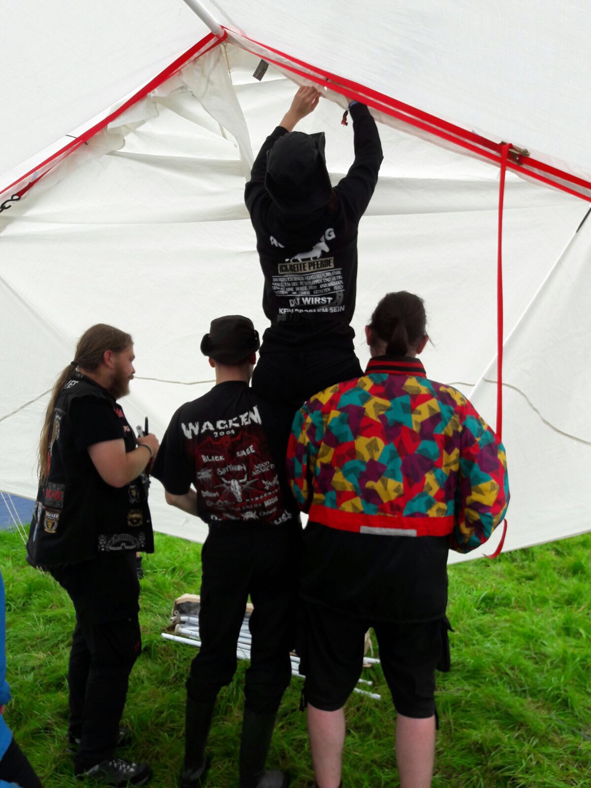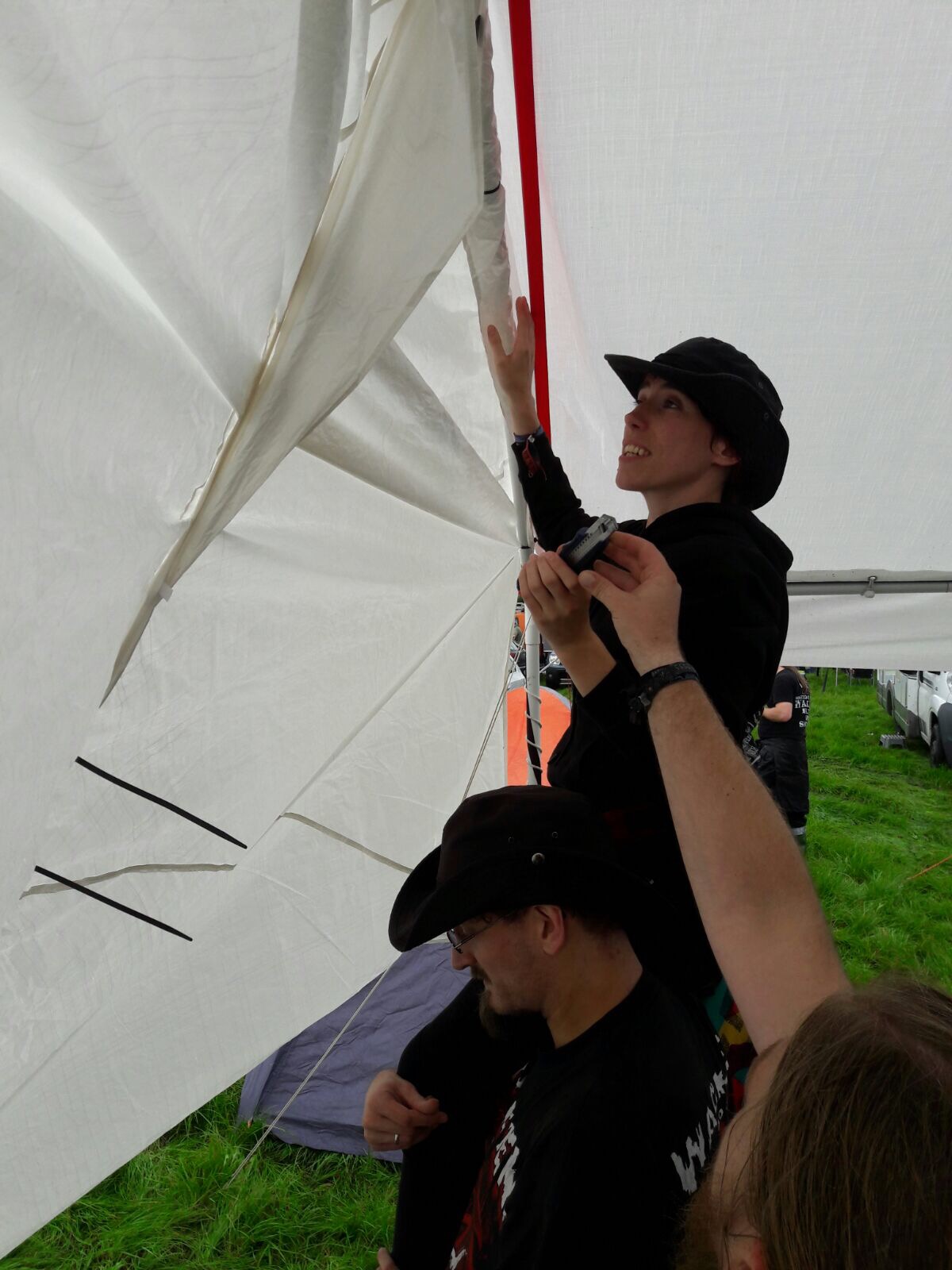 Das erste Pavilion ist Schrott. Ein großes haben wir aber noch. Die Decke vom kaputten haben wir einfach als Seitenteil umfunktioniert. Ich durfte Höhenluft schnuppern.