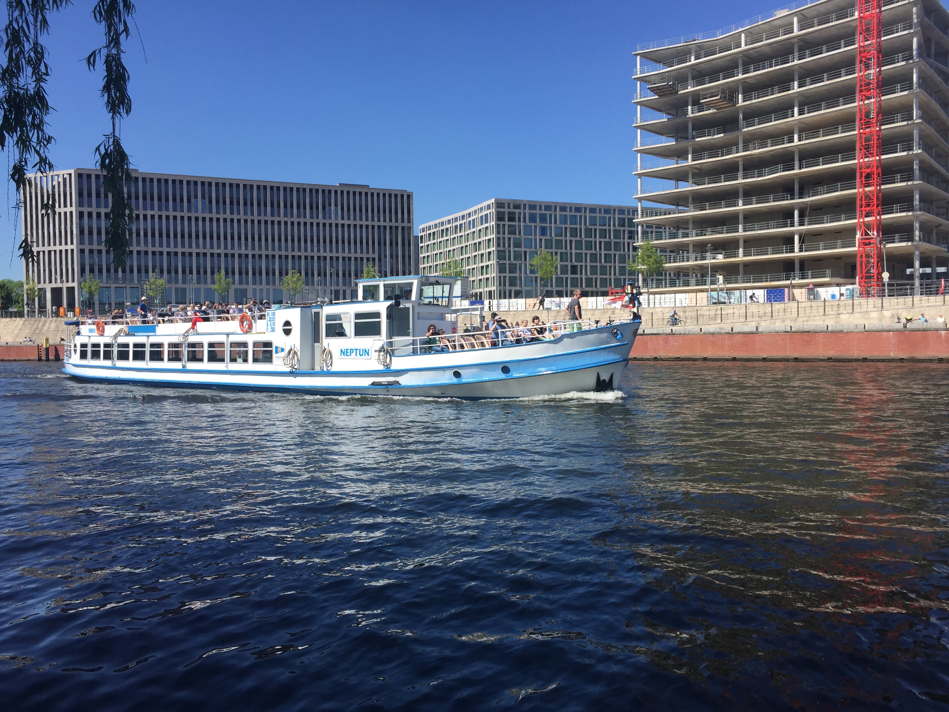 Hier auf der Spree sind mindestens 10 verschiedene Reedereien. Alle paar Minuten fährt hier ein Boot vorbei.